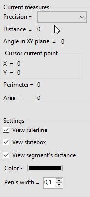 Current measures – shows current status of the chosen tool; Settings — shows current rendering settings of the measurement tool on the canvas. At the bottom of the window, you’ll see ListBox control.